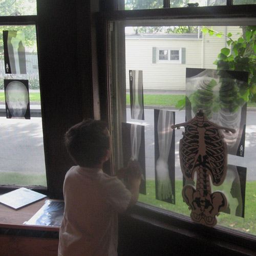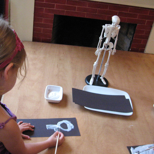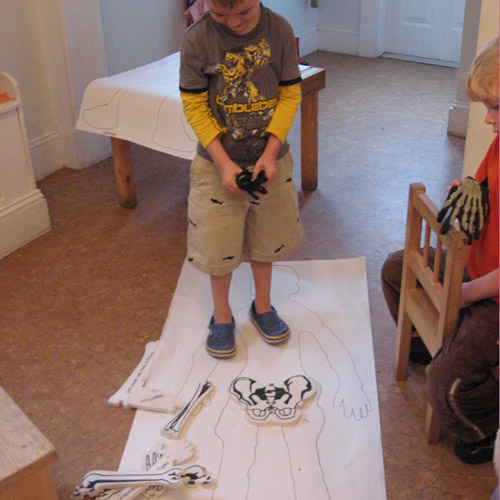 The Skeleton A skeleton puzzle is built on top of a child’s body. What does this mean? The preschool children want to be the skeleton and to know more about what is inside of their bodies. Research at the library and the museum helped the children to know more about this interesting topic. They learned the names of their bones and where they are located in the body. The children learned about archeology and many more bone related things.